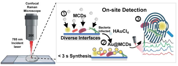 由于细菌感染的高发病率和致死率,快速检测污染表面上存在的病原体对食品安全和公共卫生至关重要。本研究利用原位瞬时制备的表面增强拉曼散射(SERS)平台,建立了一种灵敏、高效的现场监测各向异性表面食源性病原体的方法。为了实现这一目标,钼掺杂没食子酸衍生的碳点(MCDs)被用作还原剂,在室温下仅需3秒,即可合成Au@MCDs纳米复合物。该生物检测平台可在5分钟内完成对各种微生物污染界面上食源性病原体的定量检测,灵敏度为10 CFU/mL。这一创新策略打破了长期以来SERS底物在实际应用中的局限性,如耗时、残留表面活性剂的干扰、表面稳定性差、应用场景少等,为生物医学研究和临床诊断的广泛应用提供了一种有前景的工具。