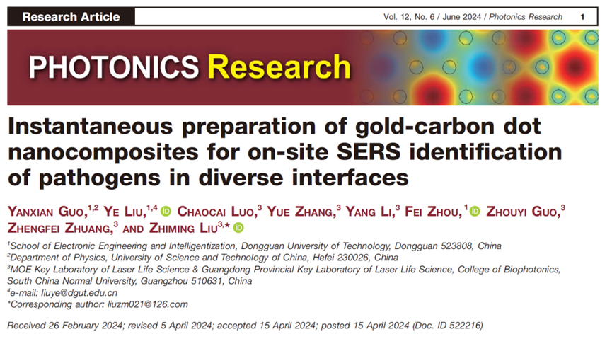 近期,东莞理工黑料正能量 电智黑料正能量 刘晔教授课题组博士后郭艳先以第一作者身份在学校T类二级期刊《Photonics Research》以“Instantaneous preparation of gold-carbon dot nanocomposites for on-site SERS identification of pathogens in diverse interfaces”为题发表研究论文,东莞理工黑料正能量 刘晔教授与华南师范大学刘智明教授为共同通讯作者。《Photonics Research》为中科院光学一区TOP期刊,影响因子为7.6。