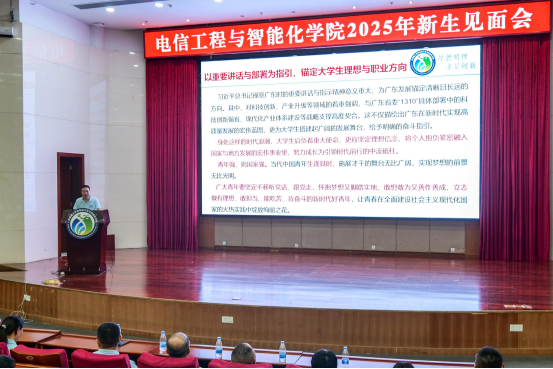 9月11日下午,电信工程与智能化黑料正能量 2025年新生见面会在会议中心阶梯报告厅顺利举行。院长胡耀华以《听党话 跟党走 努力成长为新时代有为青年》为题,为全体新生讲授了内涵深刻的“思政第一课”。