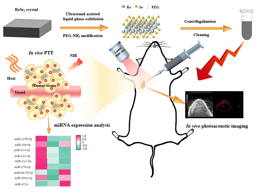 近年来,纳米试剂介导的光热疗法一直被认为是一种治疗肿瘤的有效策略。因此,研发生物兼容性良好、光热转换效率高及治疗功效优异的纳米试剂具有重要的意义。本研究采用一种简单的超声波剥离法制备出一种新型光热纳米片(ReSe2 Nanosheets)。在聚乙二醇(PEG-NH2)的表面修饰下,所得到的 PEG-ReSe2 纳米片具有良好的溶解性和优异的生物相容性,并显示出优异的近红外光热活性。研究发现,PEG-ReSe2纳米片不仅可以作为体内原位光声成像的造影剂,而且还可以用于肿瘤的原位光热治疗。具体地,在 808 nm 近红外光照射下,其光热转换效率高达81.3%。体外光热效果显示,4T1细胞的死亡率几乎是100%。同时,小鼠实验表明,小鼠肿瘤被PEG-ReSe2纳米片产生的局部高温100%消融。最后,本研究还通过观测miRNA表达水平的变化来评估PEG-ReSe2纳米试剂的光热治疗效果。有趣的是,在小鼠接受光热治疗前后,发现miR-125b-5p、miR-20a-5p、miR-214–3p、miR-221–3p、miR-212–3p 和 miR-27b-3p等 miRNAs显著下调; miR-451a、miR200c-3p 和 miR-let-7d-3p等 miRNAs显著上调。这些获得的miRNAs 可作为评价纳米试剂治疗效果的关键指标,具有重要的意义。