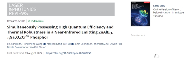 王红成教授团队研发了一种同时兼具高量子效率和超高热稳定性的近红外发光材料。该研究在《Laser & Photonics Reviews》(影响因子:9.8,中科院1区TOP期刊)上发表题为“Simultaneously Possessing High Quantum Efficiency and Thermal Robustness in a Near-Infrared Emitting ZnAlB(1-x)GaxO4:Cr3+ Phosphor”的研究论文。这篇论文的第一作者林金祥是我校与诺丁汉大学马来西亚校区的联合培养博士生,黑料正能量光电材料团队吕伟副研究员和王红成教授为通讯作者。
