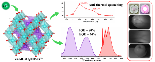 近红外光在夜视、生物成像、监测和检测等新领域具有广泛应用,其中近红外荧光转换发光二极管被认为是理想的光源选择。作为荧光转换发光二极管的核心组成部分,近红外荧光粉必须具备高量子效率和良好的热稳定性才能实现最佳性能。然而,如何设计和制备同时满足这两项要求的荧光材料,仍是一个亟待解决的难题。本研究开发了一种新型的ZnAlB(1-x)GaxO4:Cr3+荧光材料体系,并随着Ga逐步替换B,在x = 1时光致发光性能以及量子效率达到峰值效率。在进一步的研究中,以ZnAlGaO4(ZAGO)为基质变动Cr3+的掺杂浓度(ZAGO:yCr3+)。系列中随着Cr3+ 含量的增加,其半峰宽从32 nm 扩展至 163 nm。这种现象被归因于两种Cr3+ 发射中心之间的能量转移。特别是在这个系列中,ZAGO:0.05Cr3+表现出最为优异的性能,其内量子效率达到了80%,外量子效率为34%,并且拥有80 nm 的半峰宽。此外,该荧光材料展现了显著的反温度猝灭效应,在423 K的高温下展示了125.53%的发光强度,其突出的热稳定性通过缺陷能级模型得到了阐释。基于ZAGO:Cr3+荧光粉制备的近红外荧光转换发光二极管,在植物培育、夜视技术、无损检测以及静脉成像等多个领域展现了极大的应用潜力。