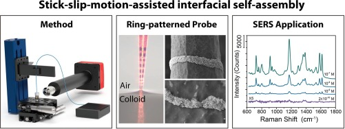 最近,为了进一步提升光纤SERS探针的检测灵敏度,针对具有更大相互作用面积的锥形光纤结构,团队在实验上发现了一种新颖的激光诱导下锥形光纤与纳米颗粒溶胶间形成的弯液面的粘滑运动,并基于此发展了“粘滑运动辅助的界面自组装法”,成功在光纤锥面制备出纳米颗粒环状分布的光纤SERS探针(如图2所示)。得益于每个纳米颗粒环中包含的数量众多的纳米颗粒团簇结构提供的大SERS增强因子,以及探针的SERS整体激发与积分收集效应,该类锥形光纤SERS探针展现出高的液相原位检测灵敏度(结晶紫溶液:2.0 × 10-10 M,孔雀石绿溶液:1.0×10-9 M,福美双溶液:1.0×10-9 M)和优良的光谱检测重复性(RSD <6%),从而在生物医药、食品安全、环境检测等领域的液相原位光谱检测应用中具有重要应用前景。