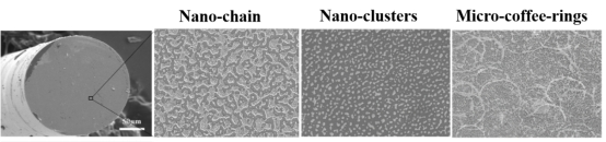 前期,团队针对平端面光纤结构,先后发展了激光诱导蒸发自组装法(ZL201811144372.6,ZL201811414826.7)、激光诱导一步提拉法(ZL201811144266.8)、飞秒激光诱导还原法(ZL201811342587.9)等多种制备方法,在光纤平端面制备出具有大SERS增强的纳米结构(如图1所示),例如纳米颗粒链状结构(Nanoscale, 2016, 8, 10607)、微咖啡环纳米结构(Sensors and Actuators: B. Chemical, 2019, 299, 126990)、纳米颗粒团簇结构(Optics Express, 2020, 28, 6649; Optics Express, 2022, 30, 15846)等,显著提升了液相原位SERS光谱检测的灵敏度和重复性。