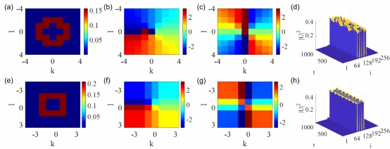 图1: 携带5个拓扑荷的两种类型的量子液滴。(a-d)第一种类型量子液滴的密度分布、相位、线性稳定性分析和动力学实时演化稳定性分析。(e-h)第二种类型量子液滴的密度分布、相位、线性稳定性分析和动力学实时演化稳定性分析。