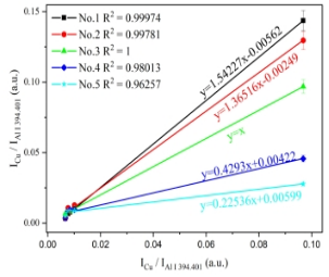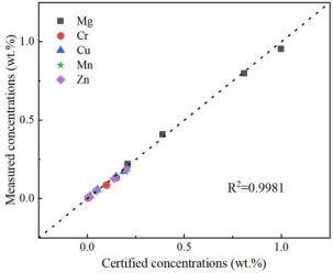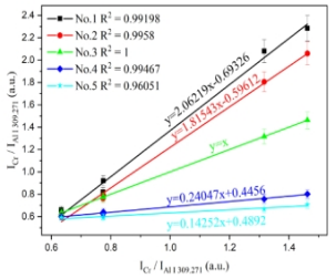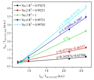 该文章研究了将飞秒激光剥离-火花诱导击穿光谱技术(femtosecond laser-ablation spark-induced breakdown spectroscopyfs-LA-SIBS)与单标样和多谱线定标方法One-point and multi-line calibrationOP-MLC相结合,对铝合金样品中微量元素定量分析的可行性。该方法只需一个标准样品即可对未知样品元素进行定量分析,它利用未知样品与标准样品中分析元素的多条特征谱线强度获得线性拟合斜率,利用该斜率值和标准样品元素含量值就可计算出未知样品元素含量。该研究实现了对铝合金中的微量元素MgCrCuMnZn的定量分析,对此方法进行了验证。结果如图1和图2所示,该方法可实现低含量元素的精准定量分析,无需对所含元素含量的归一化处理,不同元素分析结果互不影响;对5个铝合金测试样品中痕量元素MgCrCuMnZn的定量分析平均相对误差分别为6.428.121.919.020.0%。该方法为fs LA-SIBS技术进行快速定量分析提供了便捷的方法。(文章链接:
