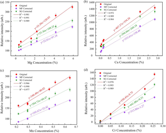 3. fs-LIBS技术中MF校正和SG校正方法得到的铝合金中MgCuMnCr元素的标定曲线。 (a) Mg I 285.21 nm(b) Cu l 324.75 nm(c) Mn I 403.44 nm,和 (d) Cr I 428.97 nm
