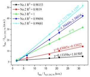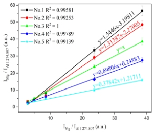 1. 未知样品和标准样品中分析元素归一化谱线强度关系:(a) Mg(b) Cr(c) Cu(d) Mn(e) Zn.