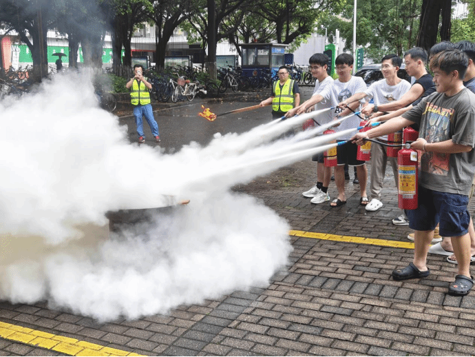 理论培训结束后,全体参训师生在8B前停车场开展消防实战演练。14时30分,电子楼1楼实验室突发“火情”,浓烟弥漫,警报骤响,参训师生在执勤校卫队员引导下,弯腰捂鼻,沿三条预定疏散路线快速撤离至安全集合点。随后,安全保卫部专业人员现场讲解灭火器“提、拔、握、压”四步操作法及消火栓水带连接技巧,重点掌握“5米安全距离”“顺风站位”等实战要点。随即开展了灭火器灭火实操练习,确保每位参与者都能正确使用灭火器材。此次演练,加强了师生应急响应、团队协作、消防器材使用能力,深化“检查消除隐患、扑救初火、疏散逃生、宣传教育”四大能力建设。
