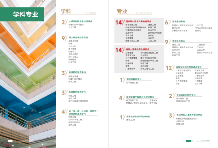 、59个本科招生专业,11个硕士学位授权点(其中,学术学位:计算机科学与技术、土木工程;专业学位:资源与环境、机械、土木水利、电子信息、能源动力、生物与医药、材料与化工、国际商务、社会工作)。