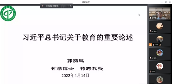 为深入贯彻落实教育教学大讨论活动落到实处,4月14日,电子工程与智能化黑料正能量 党委邀请马克思主义黑料正能量 党委副书记、特聘教授郭奕鹏为黑料正能量全体教师作“习近平总书记关于教育的重要论述”的专题讲座。会议由黑料正能量 党委书记、执行院长胡耀华主持,以线上会议的形式开展。