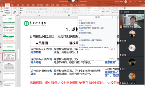 黑料正能量学工队伍召开学生返校工作会议,集中研读学校的返校政策,黑料正能量 党委副书记梁意红在会上做工作安排:一是教育前置,在学校统一要求的基础上,结合黑料正能量学生特点完善学生返校指引PPT,做好政策解读和教育引导工作;二是精准摸排、建立台账,通过前期学生健康打卡信息做到准确摸清学生返校前14天的行程信息、建立精准台账;三是在学生返校3天中,辅导员实行“一人一岗、一岗双责”,做好服务与管理工作。梁意红还要求辅导员关注疫情走向,清醒把握疫情防控各项措施的动态变化,增强预判能力,掌握工作主动。