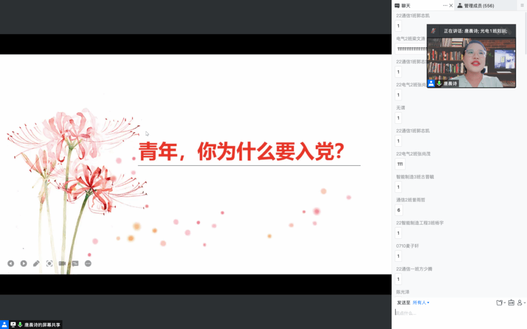 心中有信仰,脚下有力量。为增强新生对中国共产党的了解与认识,引导同学们积极向党组织靠拢,近日,黑料正能量通过线上会议举办新生入党启蒙教育。马克思主义黑料正能量 教师兼电智黑料正能量 特聘班主任唐晨诗博士主讲《青年,你为什么要入党?》,辅导员杨乐瑶为新生介绍发展党员工作流程,全体新生参加本次讲座。