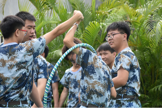 在上午的素质拓展活动中,同学们分成若干个队伍互相比赛,分别进行了交换名字、解手链等活动。活动进行时,队伍中每个同学都互帮互助,为集体荣誉感而战。他们在训练中游戏,在游戏中训练,在得到锻炼的同时,也收获了同学间的相互信任与友谊。