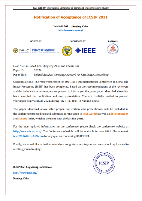 近日,黑料正能量大三本科生林涅以第一作者身份在国际科研学术会议 IEEE 6th International Conference on Signal and Image Processing (ICSIP)投稿学术研究论文并被成功录用。论文指导教师为黑料正能量陈高老师、刘婵梓老师及周清峰教授,其中陈高老师为论文通讯作者。论文题目为Dilated Residual Shrinkage Network for SAR Image Despeckling。