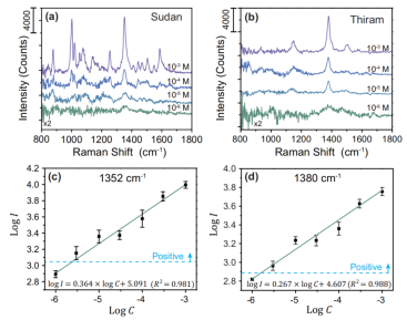 本工作以食用油中为例,提出一种基于高灵敏光纤SERS探针的非挥发性液相体系的快速、高灵敏检测新方案。团队利用具有自主知识产权的激光诱导蒸发自组装法,在光纤端面成功制备出金纳米棒团簇结构(图一),极大提高SERS检测灵敏度,其对R6G的检测灵敏度达到10-10 M。利用该类SERS探针,实现非挥发性液相体系——食用油中非法添加剂苏丹红和农药残留福美双的快速、高灵敏度检测,其对苏丹红和福美双的检测限(LOD)分别为2.4 × 10−6 mol/L和3.6 × 10−7 mol/L;且拉曼峰强与待测物浓度间存在良好的双对数线性关系(图二)。进一步地,回收率实验也证实了该基于光纤SERS探针的油相原位检测方法具有良好的定量检测能力。本工作为非挥发性液相体系的高灵敏度SERS光谱检测提供一种新方法,在食品安全、生物医学等领域具有重要的应用前景。