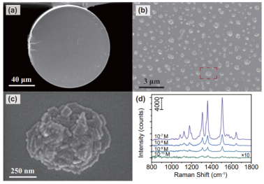 图一、激光诱导蒸发自组装法制备的光纤SERS探针及检测灵敏度